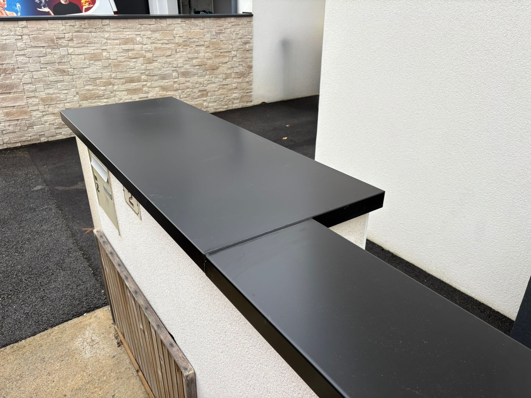 Notre client venait de faire enduire les murets de clôture autour de sa maison. Il souhaitait protéger durablement l’enduit, et nous a demandé de fabriquer et de poser des couvertines profilées DAL’ALU, ANNAPURNA. Le profilage en continu sur le chantier des couvertines en aluminium laqué permet de réaliser des couvertines de grande longueur sans jonction. Le large choix de couleur permet d’harmoniser les couvertines avec les autres éléments de la maison : les portails, les clôtures, les menuiseries…